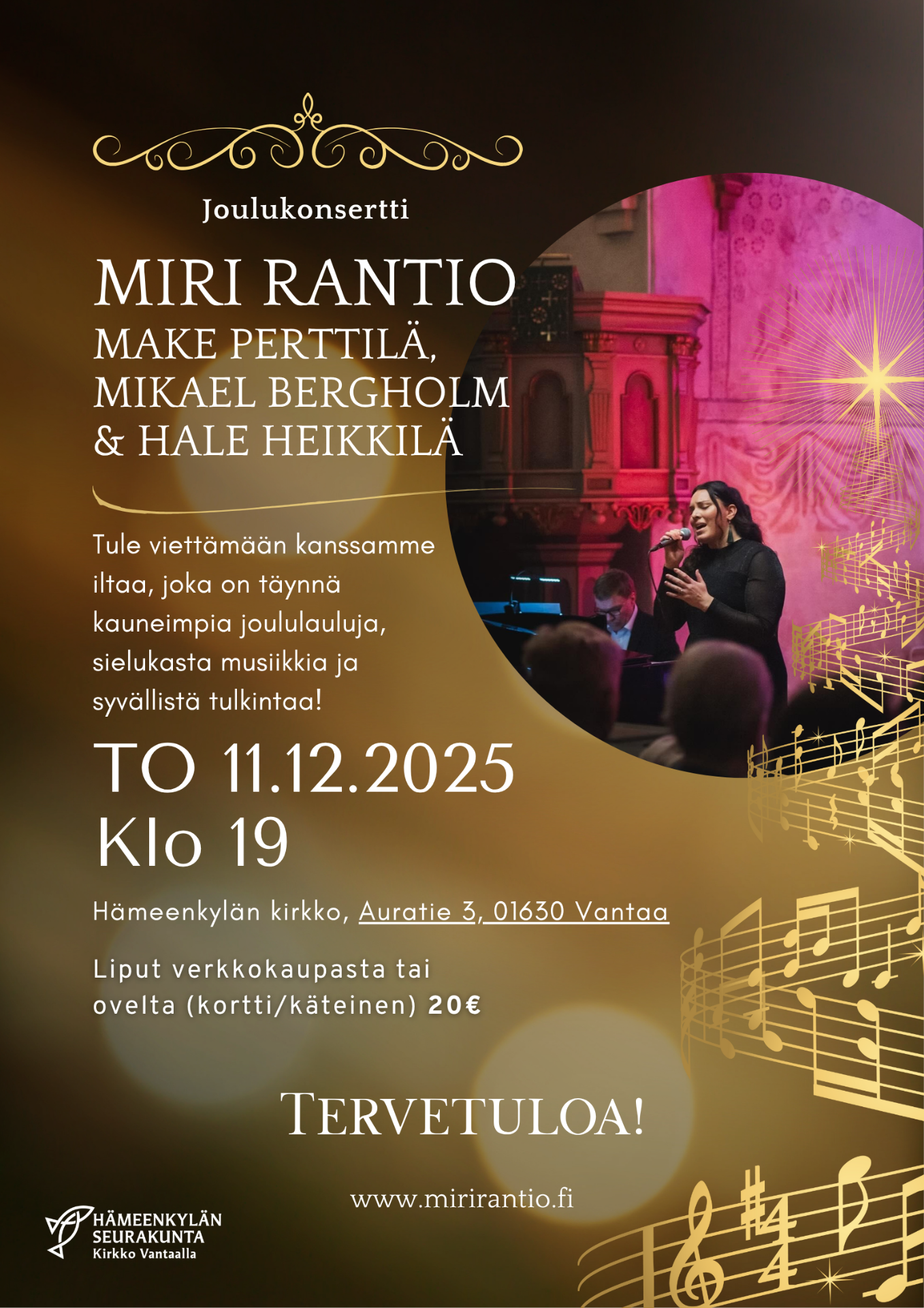 11.12. Joulukonsertti / Miri Rantio, Make Perttilä, Mikale Bergholm & Hale Heikkilä / Hämeenkylän kirkko Klo 19 >> Lipunmyynti verkkokaupassa tai ovelta klo 18.30