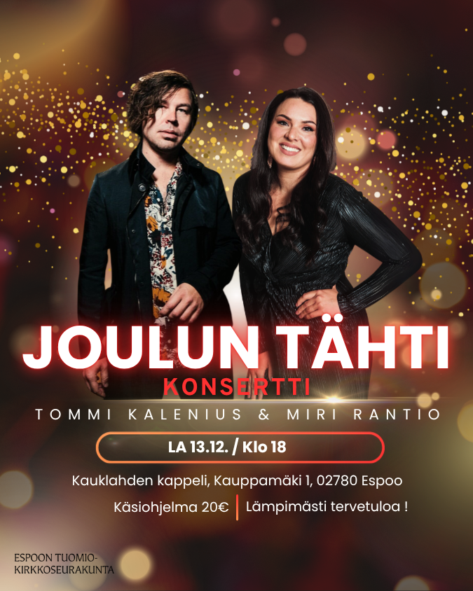13.12. Joulun tähti - konsertti / Miri Rantio & Tommi Kalenius / Kauklahden kappeli Klo 18 >> Lipunmyynti verkkokaupassa tai ovelta klo 17.30